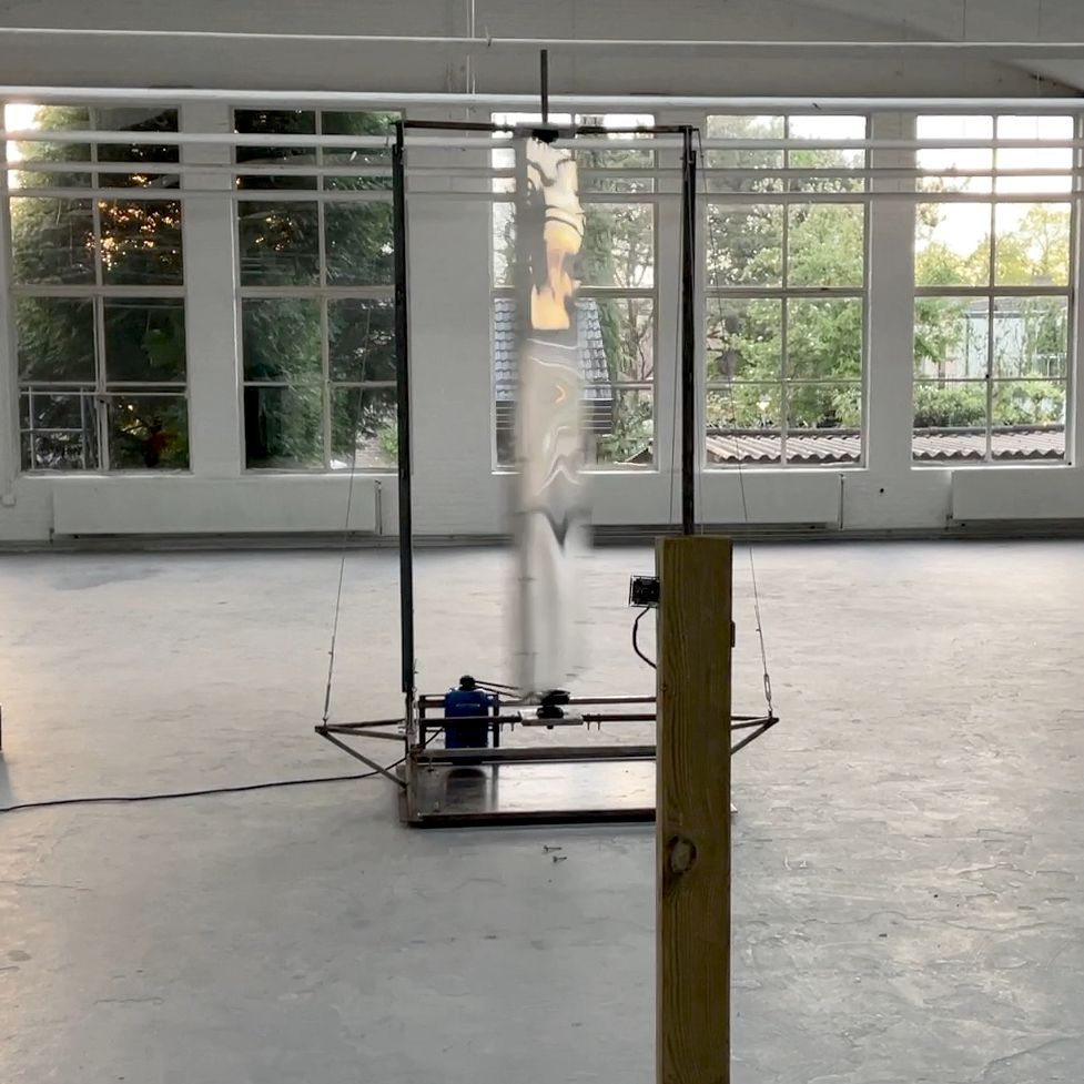 A double-sided rotating mirror turns within a metal frame while four cameras capture its shifting reflections. As the mirror accelerates, its rotational frequency aligns and misaligns with the cameras’ frame rates, producing distortions where motion appears to reverse, fragment, or stall. The installation exposes the fragile mechanics behind vision: how perception depends on synchronization, and how easily the real becomes unstable when observed through technological systems. Time becomes elastic, and motion—usually so dependable—reveals its own illusions. Exhibted at De Fabriek (Eindhoven, NL)