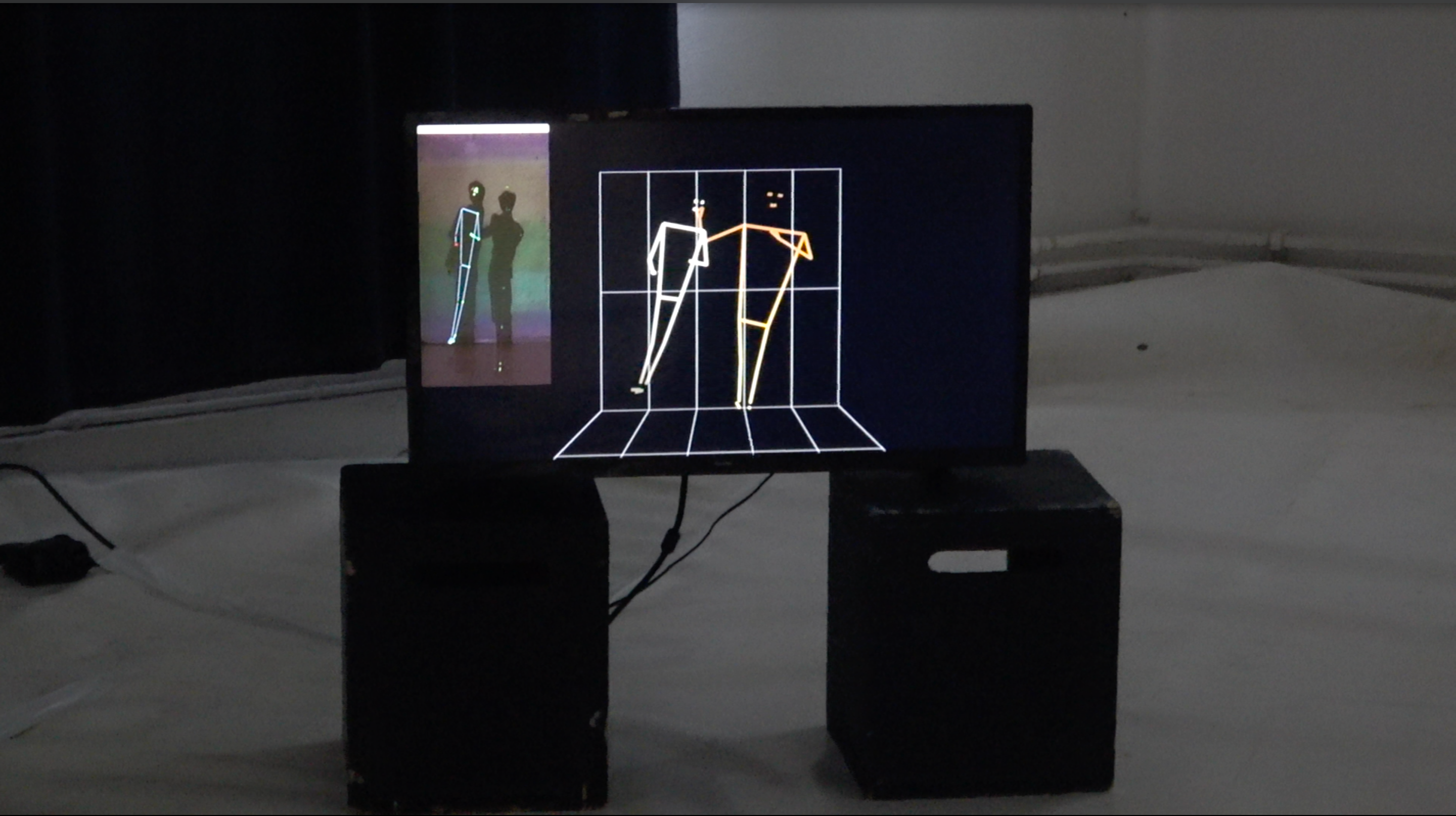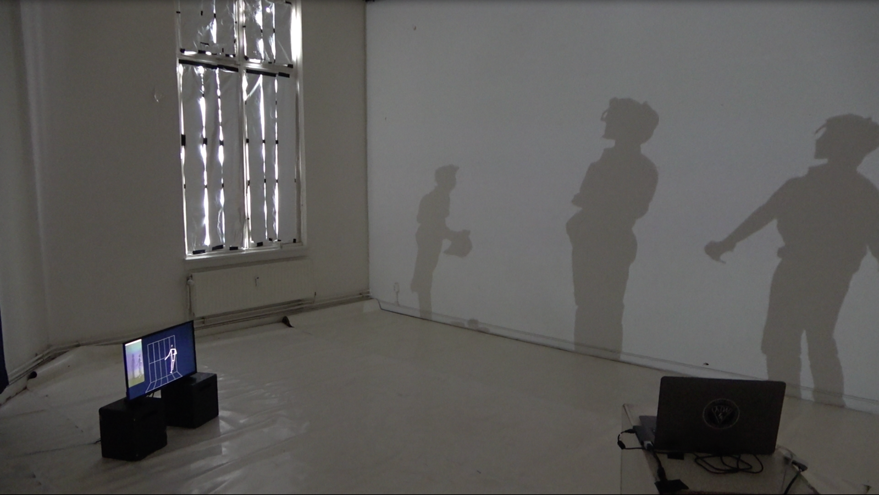 During a live performance, a computer captured shadows cast by the performer and spectators, forming the dataset used to train a Generative Advveresarial Network. The resulting artificial shadow figures appear projected in the space, blending with the real shadows of visitors. An object-detection system attempts to interpret the hybrid forms aloud, while body-tracking algorithms analyze human and artificial motion together. The work becomes a dynamic, recursive loop in which the machine tries—and fails—to understand what it sees, rendering legibility unstable.